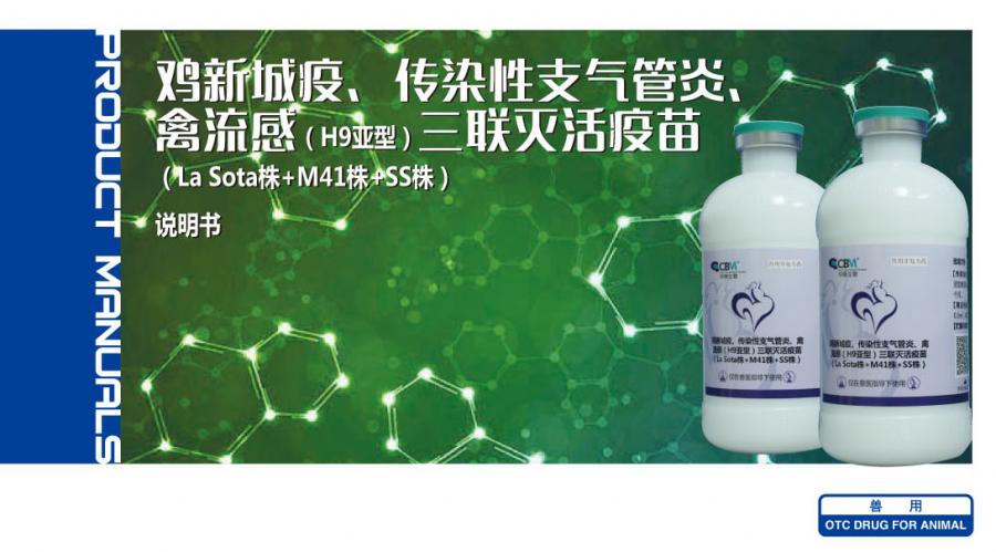 [Composition] Each dosage(0.5ml as one dosage)contains inactivated NDV (Newcastle disease strain M41,strain La Sota) ≥108.5EID50 ,IBV(infectious bronchitis virus,strain M41) ≥106.5 EID50 and AIV(subtype H9 avian influenza virus,strain SS) ≥107.5 EID50.