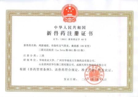 經過科研人員的共同努力,公司于2011年1月19日獲得雞新城疫、傳染性支氣管炎、禽流感(H9亞型)三聯苗滅活疫苗(La Sota株+M41株+SS株)新獸藥證書。
