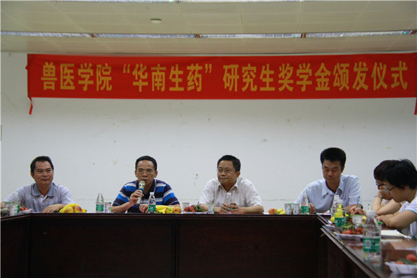 活動(dòng)首先由梁梓森書(shū)記代表學(xué)院致辭,衷心感謝廣州市華南農(nóng)大生物藥品有限公司在獸醫(yī)學(xué)院設(shè)立研究生獎(jiǎng)學(xué)金勉勵(lì)獸醫(yī)學(xué)子勤奮學(xué)習(xí)、進(jìn)取有為,并對(duì)獲獎(jiǎng)同學(xué)表示祝賀,希望同學(xué)們能再接再厲,不辜負(fù)企業(yè)與學(xué)院的期望。此外,梁書(shū)記還結(jié)合華南生藥兩位總經(jīng)理的創(chuàng)業(yè)經(jīng)歷給大家上了一堂簡(jiǎn)短生動(dòng)的創(chuàng)業(yè)培訓(xùn)課,在啟發(fā)同學(xué)們開(kāi)拓個(gè)人發(fā)展的同時(shí)也祝愿華南生藥公司的發(fā)展越來(lái)越好。企業(yè)代表梁昭平總經(jīng)理向大家介紹了華南農(nóng)大生物藥品有限公司的基本情況,并介紹了企業(yè)來(lái)學(xué)院設(shè)立獎(jiǎng)學(xué)金的初衷是以關(guān)注研究生個(gè)人發(fā)展為出發(fā)點(diǎn),通過(guò)設(shè)立獎(jiǎng)學(xué)金為紐帶增進(jìn)校企間的科技、文化交流,進(jìn)而深化產(chǎn)學(xué)研合作的形式,實(shí)現(xiàn)校企優(yōu)勢(shì)互補(bǔ)、互利共贏,希望同學(xué)們以獲得獎(jiǎng)學(xué)金資助為鞭策,加倍努力規(guī)劃好自己的學(xué)業(yè)和能力。
