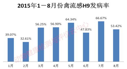 進入2015年禽流感H9的發病率一路飆升,雖然8月份禽流感發病率較7月份有所下降,但發病率依然占據很大的比例。同時根據檢測云中心對臨床數據的統計分析發現,第一雞群感染禽流感H9后,疾病所帶來的損失加大,如平均死淘率升高,個別病例死淘率日可達到2%;產蛋率波動幅度較大,開產雞群產蛋率不上升,嚴重的產蛋率下降,高者可下降10%左右。第二、禽流感H9成為養殖場的隱性殺手,當與其它疾病一起感染時,不易被診斷出來,如雞群長期腹瀉久治不愈,雖然臨床和剖檢看不到H9感染跡象的存在,當用實驗室檢測技術進行檢測時就會發現,腸炎久治不愈的原因與H9有很大的關系。第三由于禽流感H9持續感染的存在,有些雞群從環境中獲得了被動免疫,體內的抗體水平、體質和環境中的病毒攻擊力達到一定平衡,這樣的雞群沒有明顯的臨床癥狀,但當雞群受到外界應激時即平衡被打亂,極易發病,且治愈難度較大?;谝陨锨闆r對于禽流感H9的防控應從免疫、管理、生物安全等方面入手,制定一個全方位的防控計劃。