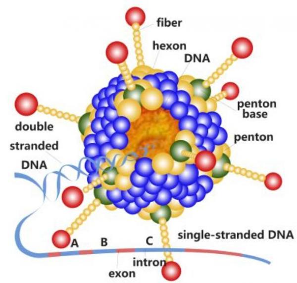 FAdV-Ⅰ為腺病毒科腺病毒屬病毒,無(wú)囊膜,直徑為70-90nm,呈20面體對(duì)稱結(jié)構(gòu)。表面由252個(gè)殼粒組成,包括240個(gè)六棱體和12個(gè)五棱體,每個(gè)五棱體有2條纖維突起。中間包著直徑60-65nm的髓蕊(雙股DNA和核蛋白),殼粒排列在三角形的面上,每邊6個(gè)殼粒。禽腺病毒具有2根長(zhǎng)度相近的纖絲,纖絲的長(zhǎng)度與抗原性有關(guān)。